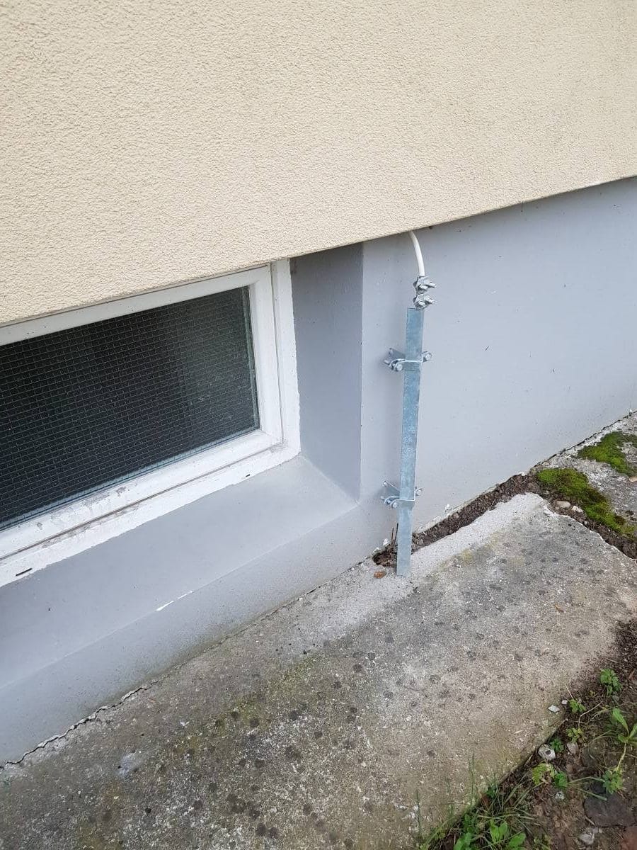 Pri inštalácii bleskozvodov je tiež nevyhnutné ošetriť všetky prechody medzi rôznymi materiálmi, ako napríklad zem a vzduch alebo betón a vzduch. Tento prechod by mal byť chránený 30cm na jednej strane a 30cm na druhej strane protikoróznou vrstvou, aby sa predišlo poškodeniu a aby to nedopadlo ako na obrázku – viď nižšie.