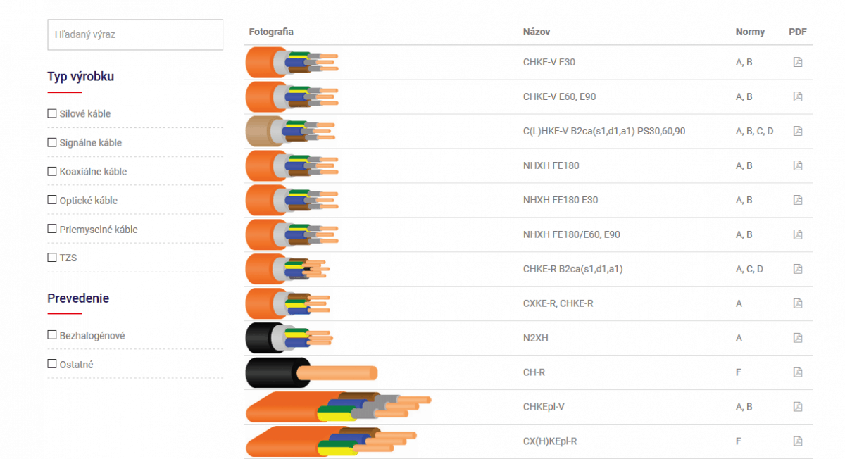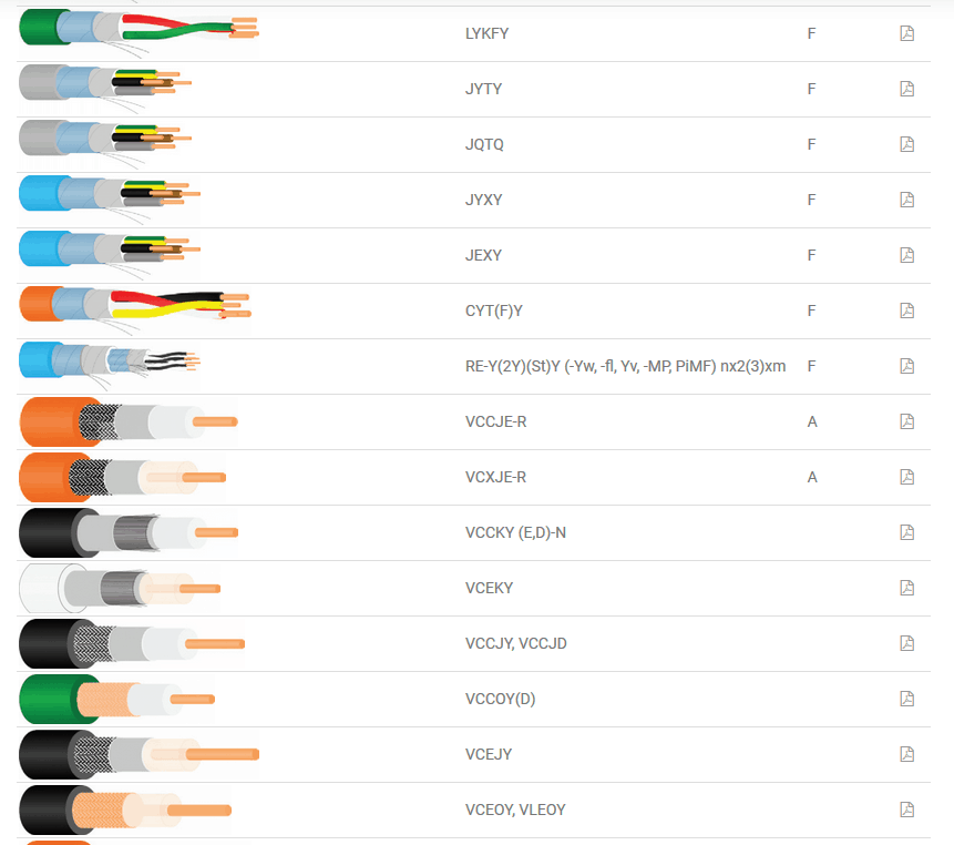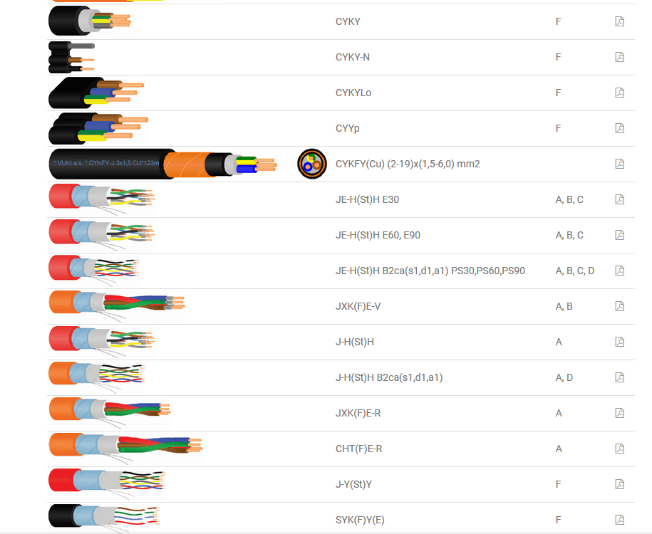 CYKY, CYKY-N, CYKYLo, CYYp, CYKFY(Cu) (2-19)x(1,5-6,0) mm2, JE-H(St)H E30, JE-H(St)H E60, E90, JE-H(St)H B2ca(s1,d1,a1) PS30,PS60,PS90, JXK(F)E-V, J-H(St)H, J-H(St)H B2ca(s1,d1,a1), JXK(F)E-R, CHT(F)E-R, J-Y(St)Y, SYK(F)Y(E)