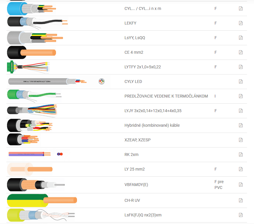 CYL… / CYL…i n x m, LEKFY, LsYY, LsQQ, CE 4 mm2, LYTFY 2×1,0+5×0,22, CYLY LED, PREDLŽOVACIE VEDENIE K TERMOČLÁNKOM, LYJY 3x2x0,14+12×0,14+4×0,35, Hybridné (kombinované) káble, XZEAP, XZESP, RK 2xm, LY 25 mm2,VBFAMOY(E), CH-R UV, LsFK(FJ)Q nx2(3)xm