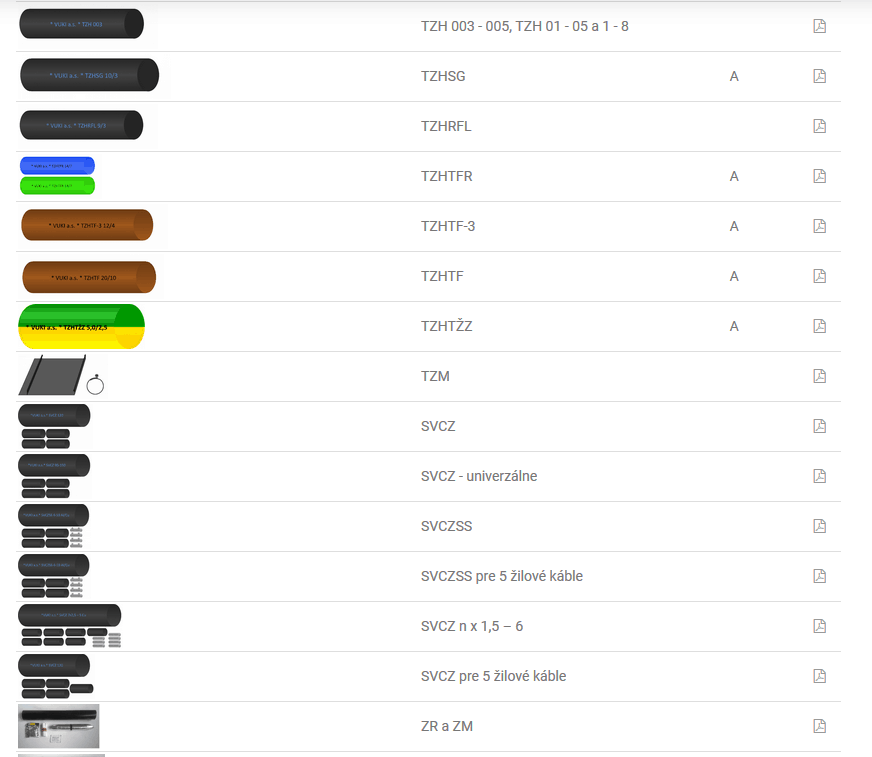TZH 003 – 005, TZH 01 – 05 a 1 – 8, TZHSG, TZHRFL, TZHTFR, TZHTF-3, TZHTF, TZHTŽZ, TZM, SVCZ, SVCZ – univerzálne, SVCZSS, SVCZSS pre 5 žilové káble, SVCZ n x 1,5 – 6, SVCZ n x 1,5 – 6, ZR a ZM