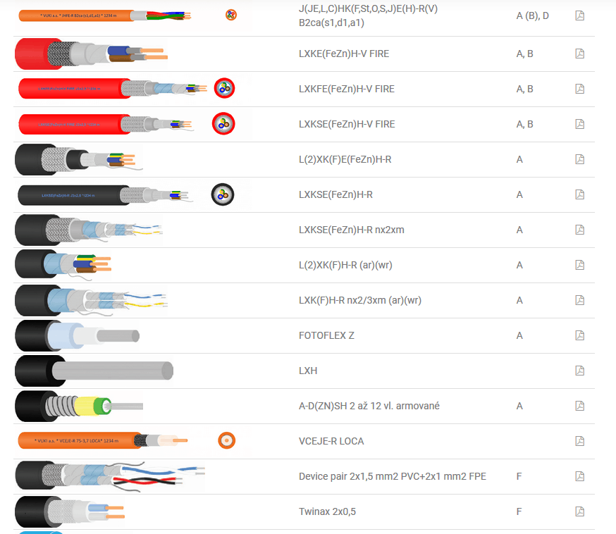 J(JE,L,C)HK(F,St,O,S,J)E(H)-R(V) B2ca(s1,d1,a1), LXKE(FeZn)H-V FIRE, LXKFE(FeZn)H-V FIRE, LXKSE(FeZn)H-V FIRE, L(2)XK(F)E(FeZn)H-R, LXKSE(FeZn)H-R, LXKSE(FeZn)H-R nx2xm, L(2)XK(F)H-R (ar)(wr), LXK(F)H-R nx2/3xm (ar)(wr), FOTOFLEX Z, LXH, A-D(ZN)SH 2 až 12 vl. armované, VCEJE-R LOCA, Device pair 2×1,5 mm2 PVC+2×1 mm2 FPE, Twinax 2×0,5