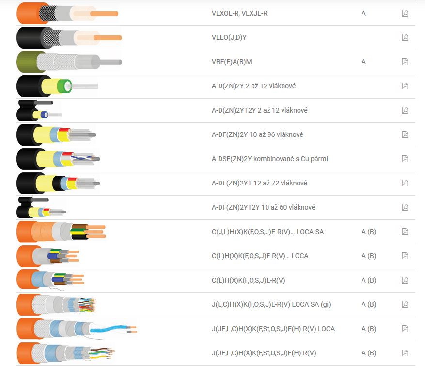 VLXOE-R, VLXJE-R, VLEO(J,D)Y, VBF(E)A(B)M, A-D(ZN)2Y 2 až 12 vláknové, A-D(ZN)2YT2Y 2 až 12 vláknové, A-DF(ZN)2Y 10 až 96 vláknové, A-DSF(ZN)2Y kombinované s Cu pármi, A-DF(ZN)2YT 12 až 72 vláknové, A-DF(ZN)2YT2Y 10 až 60 vláknové, C(J,L)H(X)K(F,O,S,J)E-R(V)… LOCA-SA, C(L)H(X)K(F,O,S,J)E-R(V)… LOCA, C(L)H(X)K(F,O,S,J)E-R(V)… LOCA, J(L,C)H(X)K(F,O,S,J)E-R(V) LOCA SA (gi), J(JE,L,C)H(X)K(F,St,O,S,J)E(H)-R(V) LOCA, J(JE,L,C)H(X)K(F,St,O,S,J)E(H)-R(V) LOCA, J(JE,L,C)H(X)K(F,St,O,S,J)E(H)-R(V) LOCA,